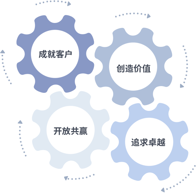 成就客户是一切决策的出发点,,,,创造价值是衡量所有工作的标准,,,追求卓越是我们做事做人的态度,,,,开放共赢是我们的格局也是最终的结果。。。。价值观的齿轮环环相扣,,,推动着组织里的每个人不断向前。。。